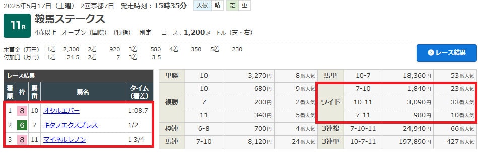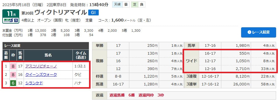 16-17のワイドだけは取れたのですが人気馬同士で5.5倍にしかなりませんでした。