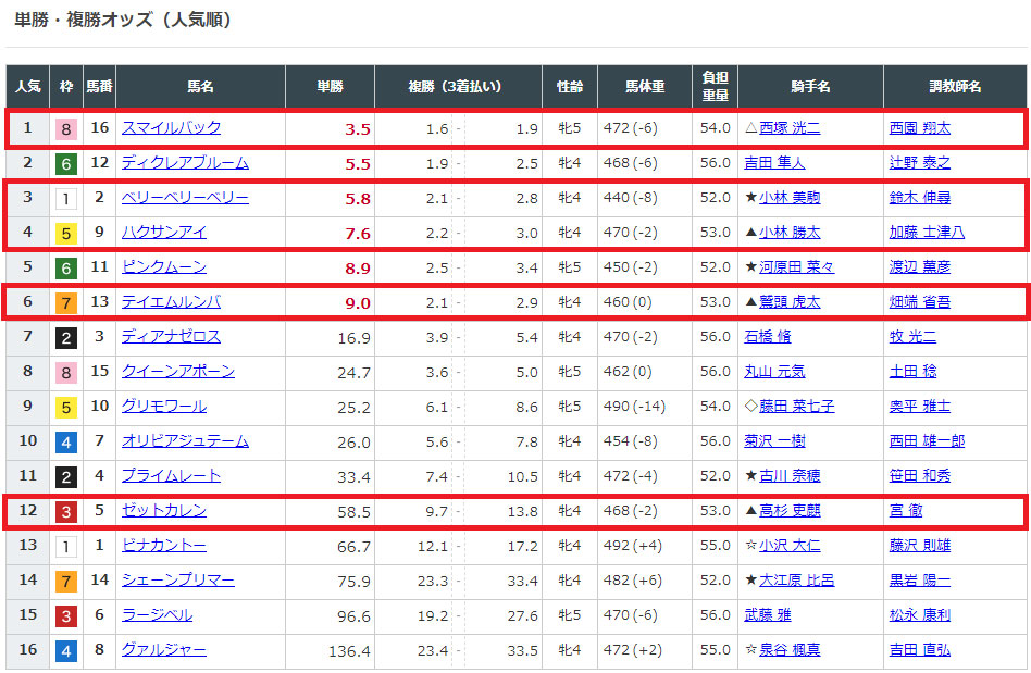 人気馬5頭と穴馬1頭を抑えた予想です。
