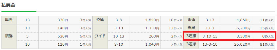 軸に置いた⑩が3着に滑り込み、相手に据えた③⑬が1着2着と馬券に絡む着順で予想どおりの結果に。