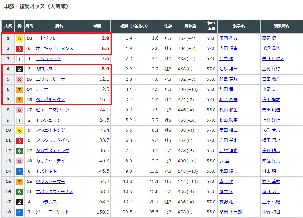 選んだ馬のオッズを見てみると