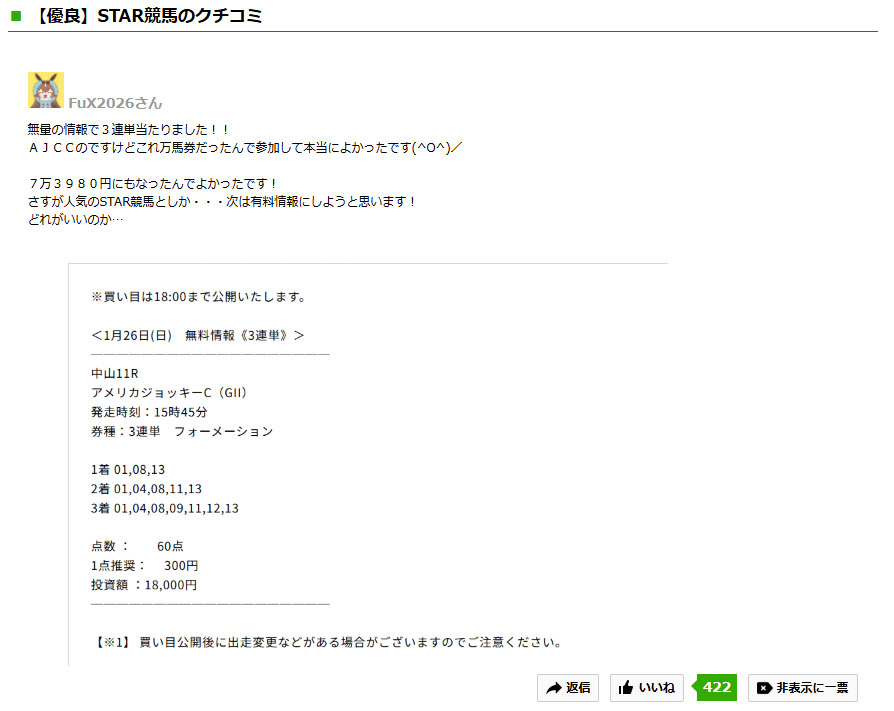 そんな中、【えーあい】とは真逆にAJCC(G2)で3連単を的中させていたサイトを発見したのでご紹介させていただきます!