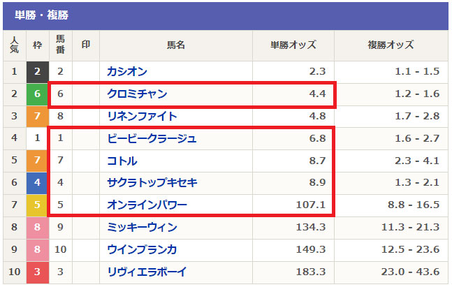1.3番人気を消した7番人気までの中穴馬を中心にした買い目です。