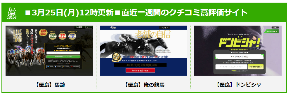 もし、新しく登録で悩まれている方は【直近一週間のクチコミ高評価サイト】や【稼げる無料予想ランキング】を参考にしてご登録へ進んでみてください!
