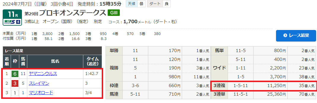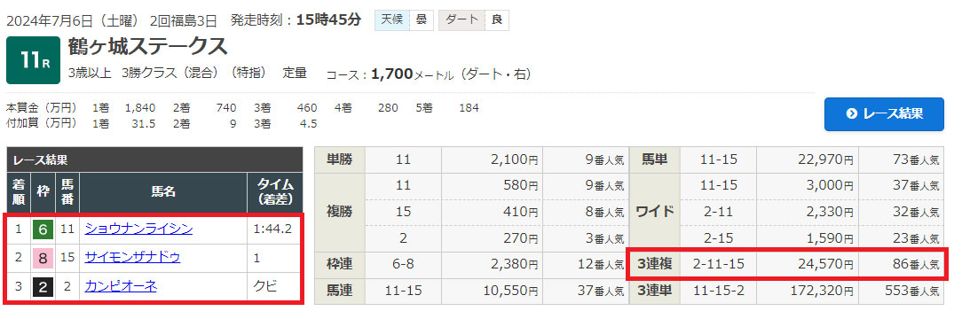 そして次の福島11Rの3連複の結果も見てみましょう。