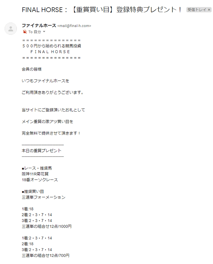 続くレースはお知らせで届いた重賞プレゼント買い目、この日のメインでもありクラシック最終戦『菊花賞』予想だ!
