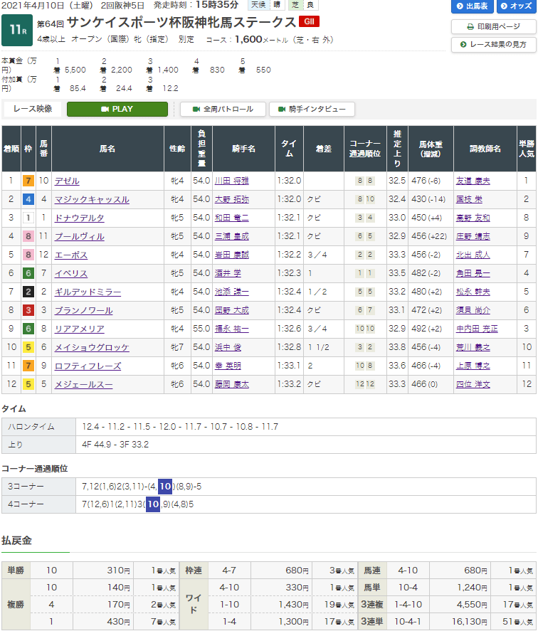 結論からいうと不的中、推奨馬?なのかは定かではないが3連複の軸にしていたマジックキャッスル(2人気)は確かに馬券になったが結果はコチラ。