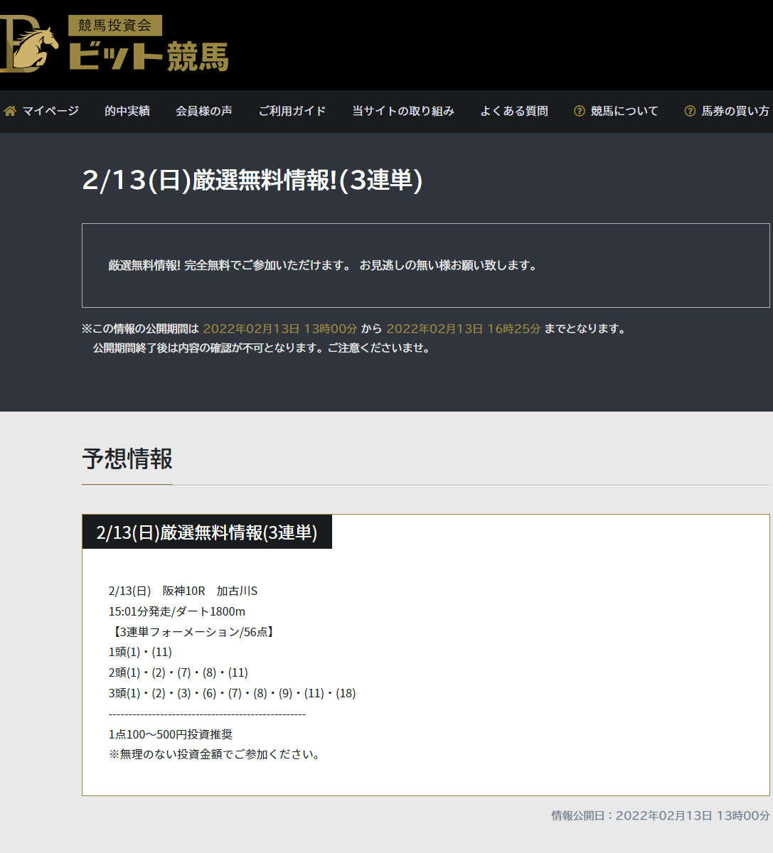 今回検証したのはビツト競馬という予想サイトの「無料情報」検証です。