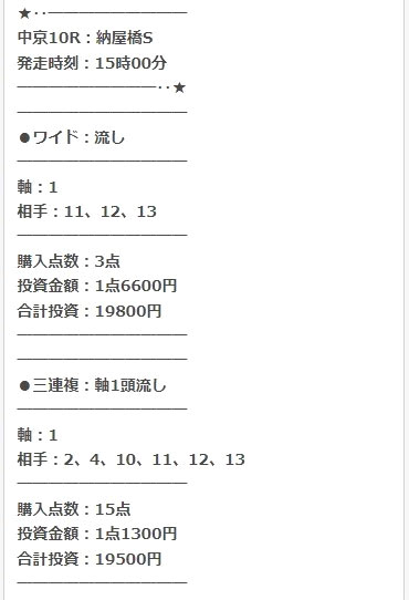 1頭軸流しのワイド3点と1頭軸流しの3連複15点の情報が出ていました。