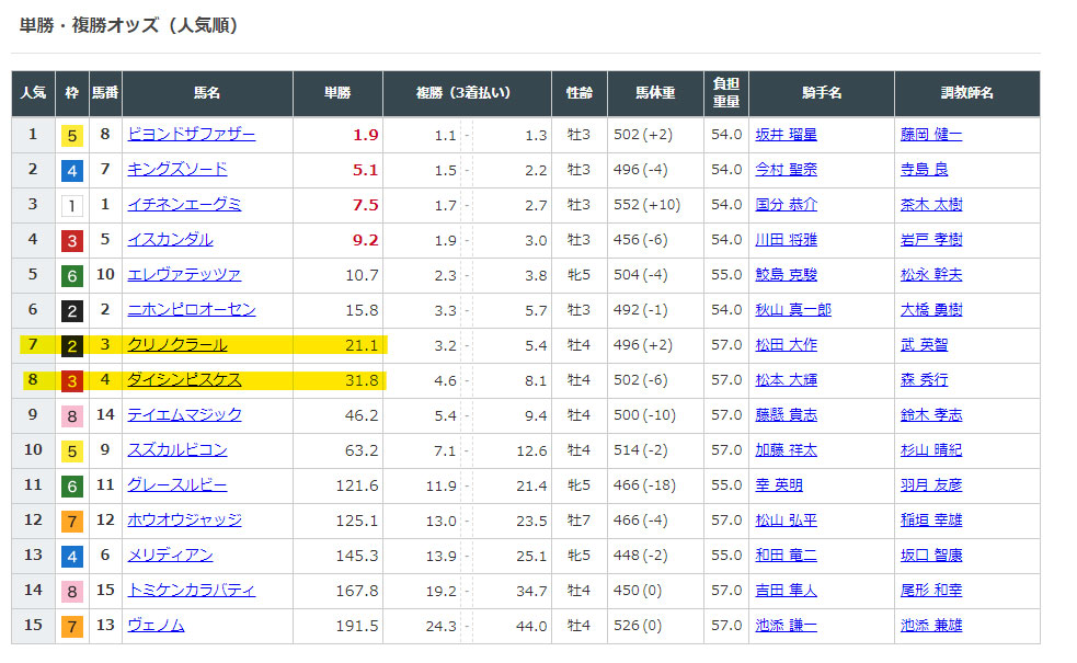 ③と④の馬はそれぞれ単勝人気7,8番人気でした。どちらも穴馬になりますね。