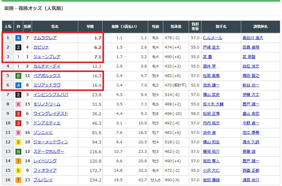 1番人気から12番人気まで幅広い人気の中から選んでいます。