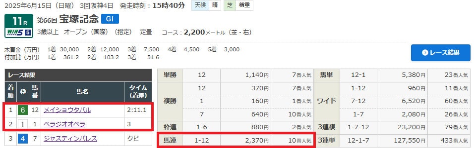 ⑫メイショウタバルは7番人気だったので1番人気のべラジオオペラ相手でも美味しい配当になりました。