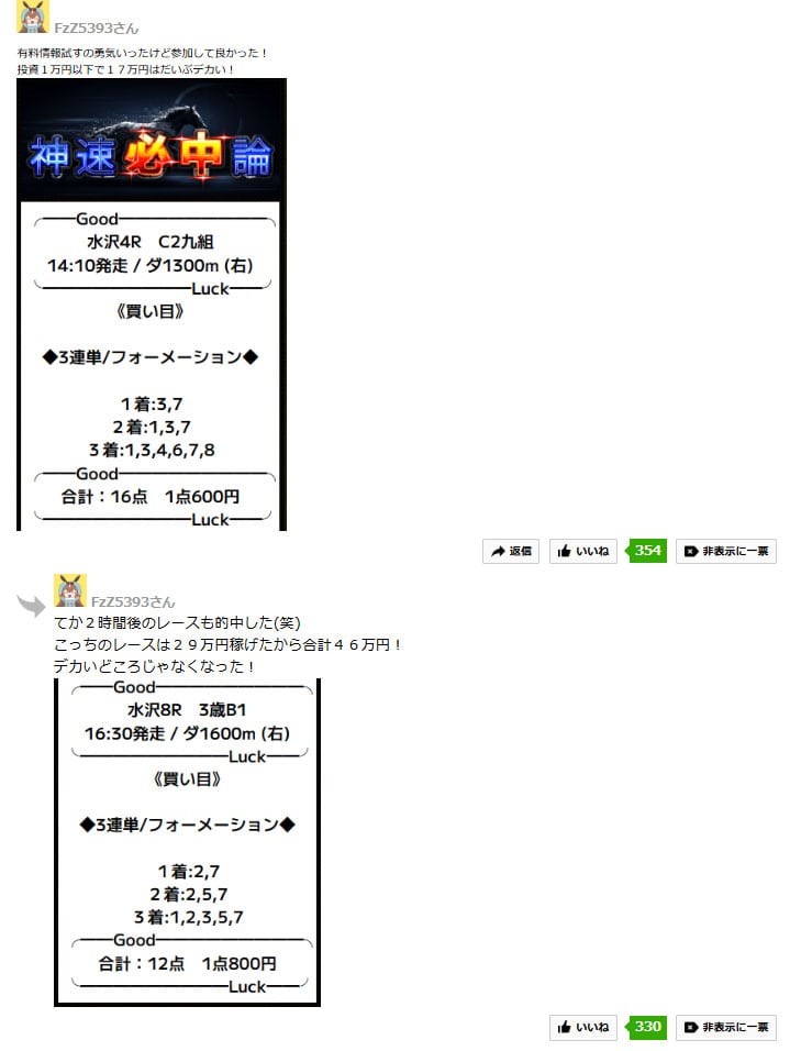 今回、【バツグン】の検証で無料情報に2日参加してみましたが、両日ともに重賞が的中して…