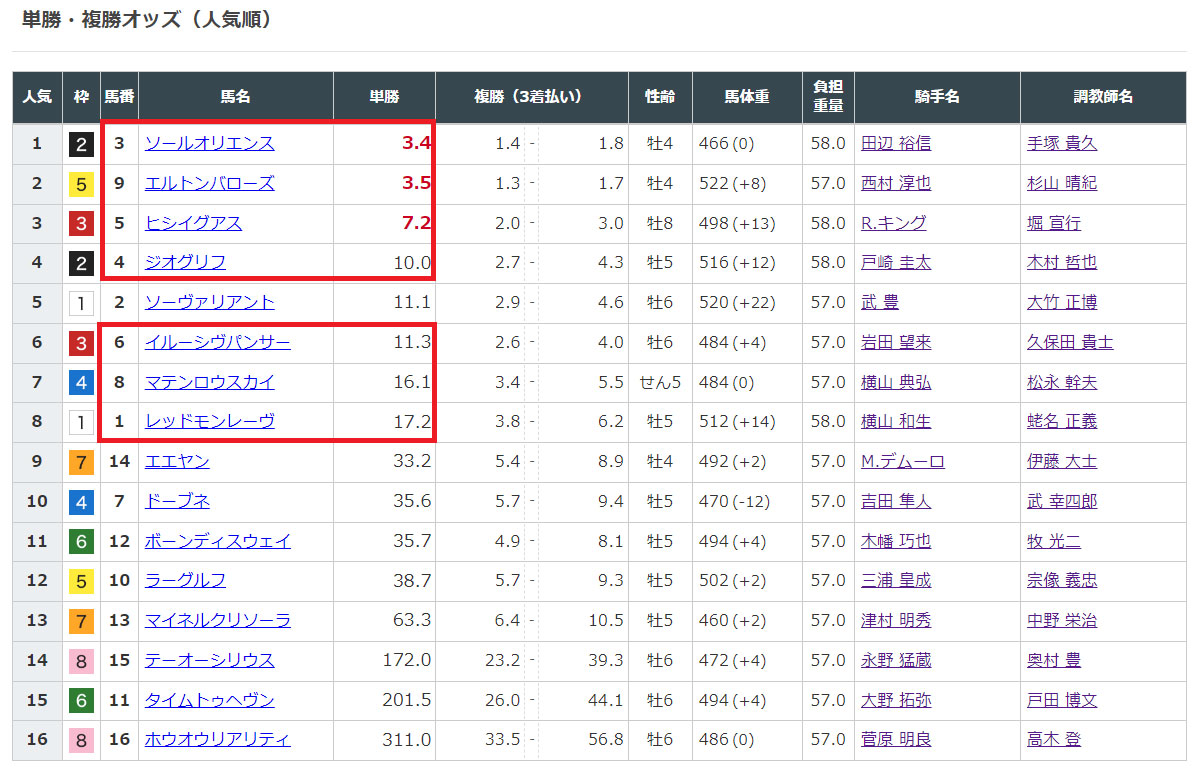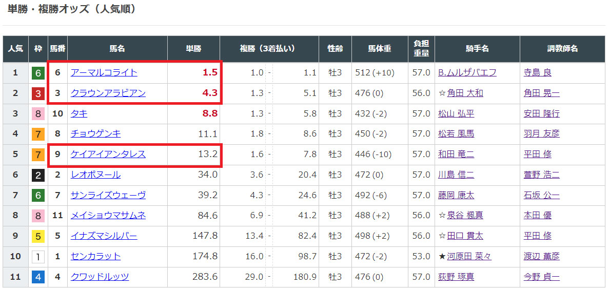 選んだ馬のオッズを見てみると今回も上位人気馬が中心のフォーメーションになりますね。