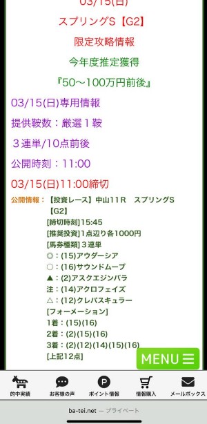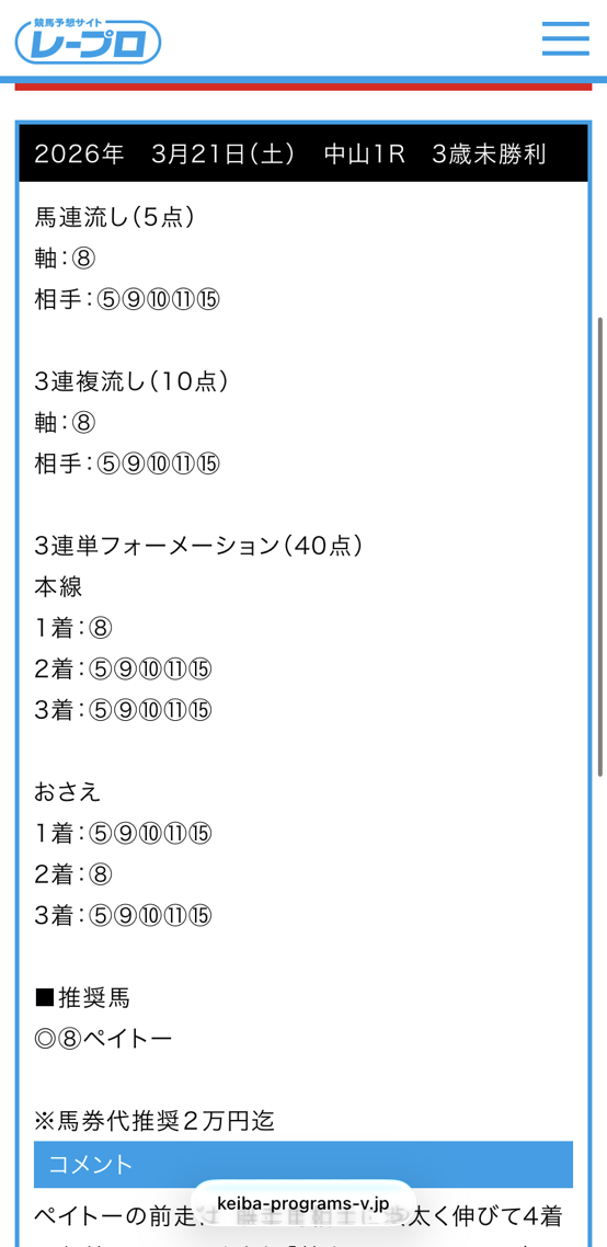 今日の無料情報3/14(土)なかなか4点で三連複当てられません💦 素晴らしい予想でした。