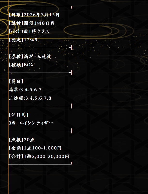 15日(日)の無料情報でめっちゃ勝てました! 朝一のレースから7万9900円とかありがたいね、金鯱賞も獲れたし大満足です!