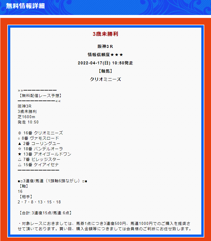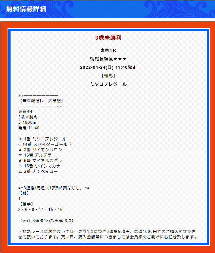 有料情報で不的中でした。お金かけてるのにこれはひどいな… もう二度と利用しません。