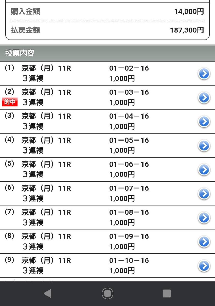 1番はどうしても買いたくてもう1頭が決まらず16番を本命にしていましたので2頭軸で相手はどれがきてもいいように全通りにしました。