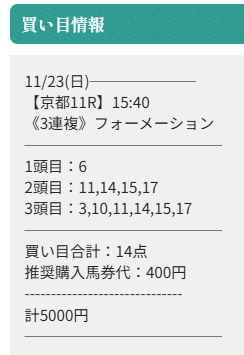 よく15人気のウォーターリヒト拾えたよな、因みに4着(11)のオフトレイルも3頭目で拾えているのは流石ですね、次回も頼みます。